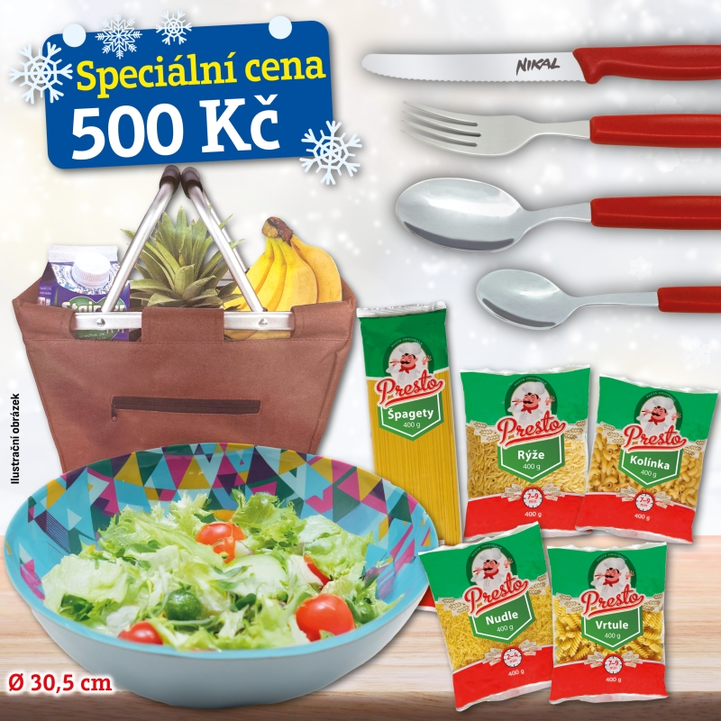 Začněte nový rok prakticky a výhodně. Novoroční 11dílná sada je pečlivě sestavený set kuchyňských doplňků a potravin, který najde své využití v každé domácnosti. Kombinuje užitečné vybavení pro vaření i stolování s oblíbenými těstovinami pro každodenní přípravu jídel.