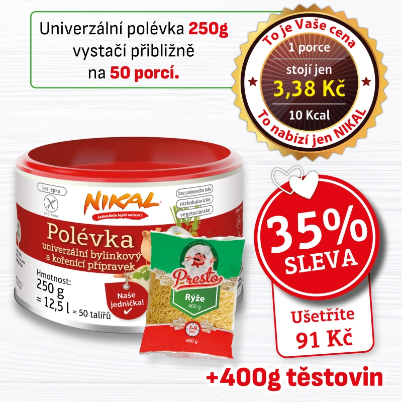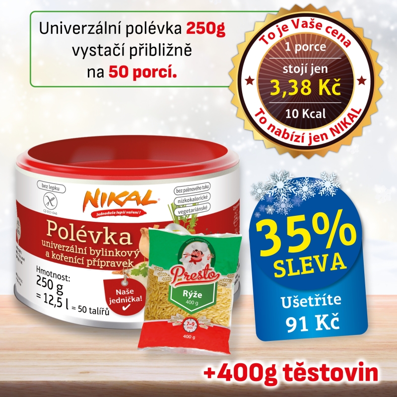 Hlavní přednost: NIKAL Polévka podtrhuje přirozenou vlastní chuť Vašich pokrmů, aniž by ji potlačila. Snadno se sype, ihned se rozpouští ve studené i teplé vodě. Ideální i jako chutný čirý vývar na svačinku nebo jako polévkový nápoj.