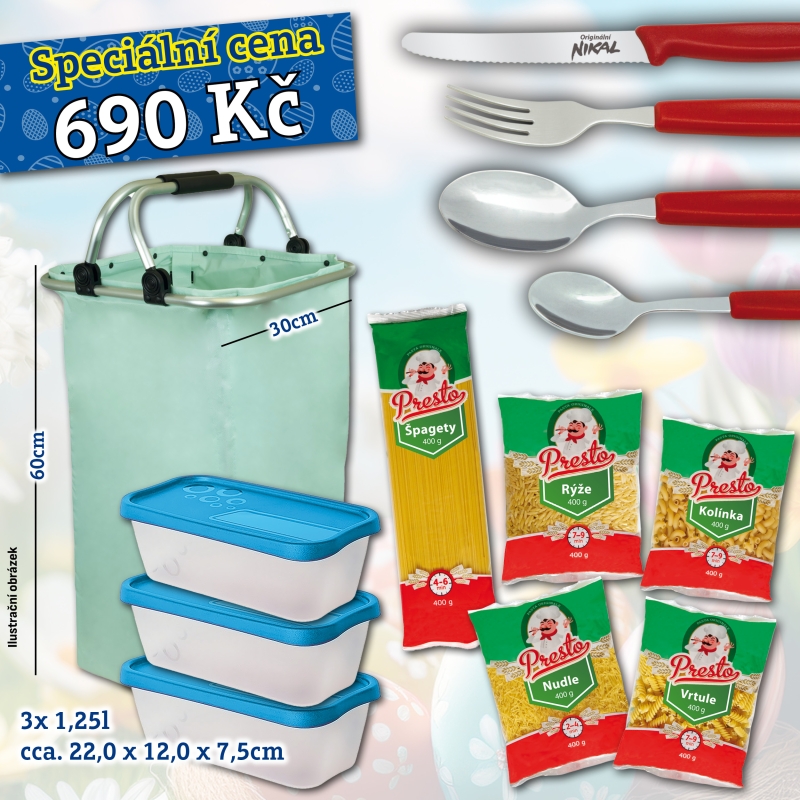 Využijte velikonoční období k praktickému doplnění domácnosti. Velikonoční sada je promyšleně sestavený set užitečných pomocníků a oblíbených těstovin pro každodenní vaření. Spojuje kvalitu, praktičnost a výraznou úsporu v jednom balení.