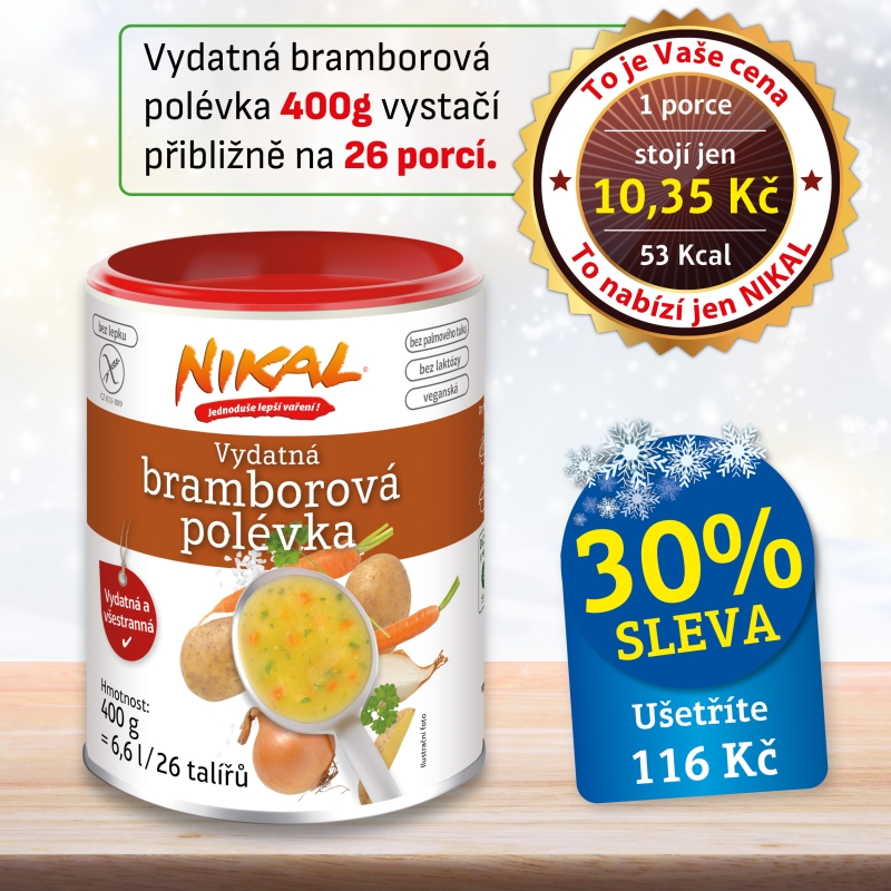 „Vykouzlíme z nich to nejlepší,“ říkala vždy babička. A co se dá z čerstvých brambor udělat lepšího než lahodná bramborová polévka? No samozřejmě! Bramborová polévka NIKAL! Zpestřit ji můžete např. zeleninou, osmaženou cibulkou, párkem, slaninou, mlékem nebo smetanou. Ať vyzkoušíte cokoli, výsledek bude vždy perfektní! Použijte NIKAL Bramborovou polévku k zahuštění zeleninových a čočkových jídel. Budete nadšeni!