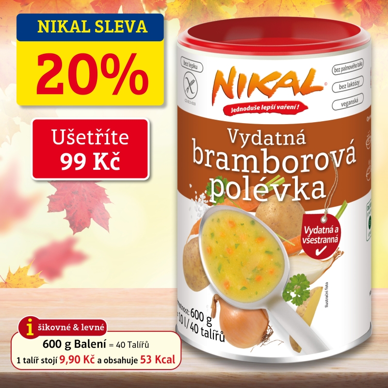 Brambory patří mezi všestrannou zeleninu: výborně chutnají samostatně, jako příloha i v podobě vydatné polévky. Naše NIKAL Vydatná bramborová polévka spojuje pečlivě vybrané brambory a v kombinaci se zeleninou, restovanou cibulkou, párky nebo opečenou slaninou získáte výživný a sytý pokrm. Kdo má raději lehčí verzi, přimíchá trochu mléka nebo smetany. Navíc polévkovou směsí můžete skvěle zahustit například bramborovou kaši.